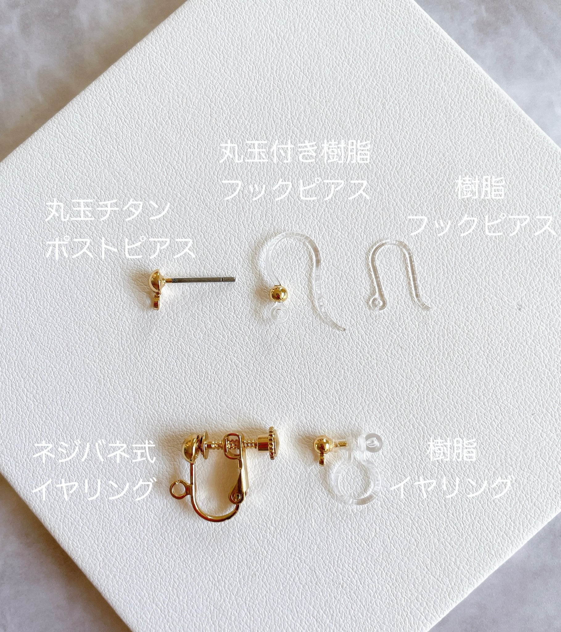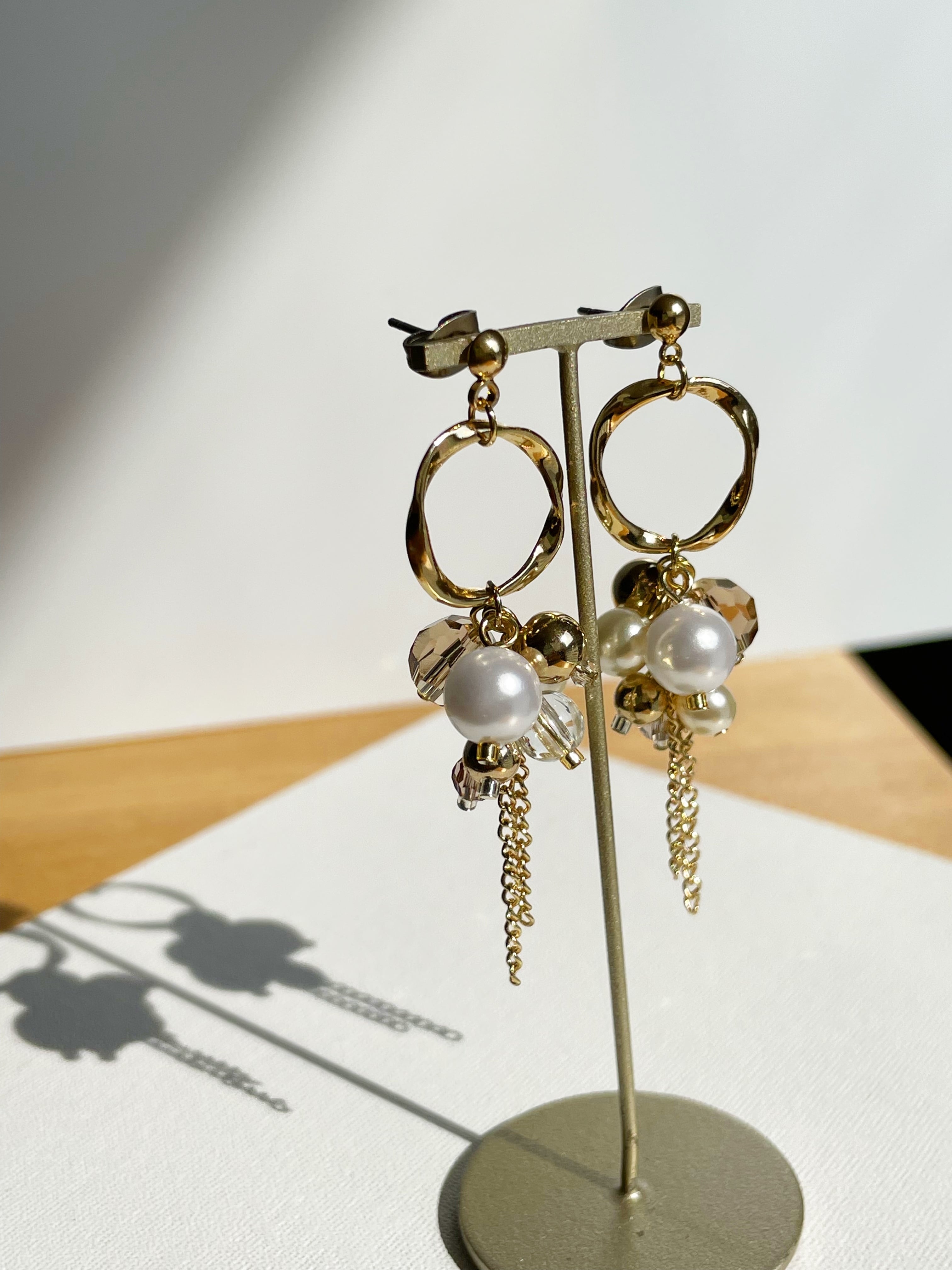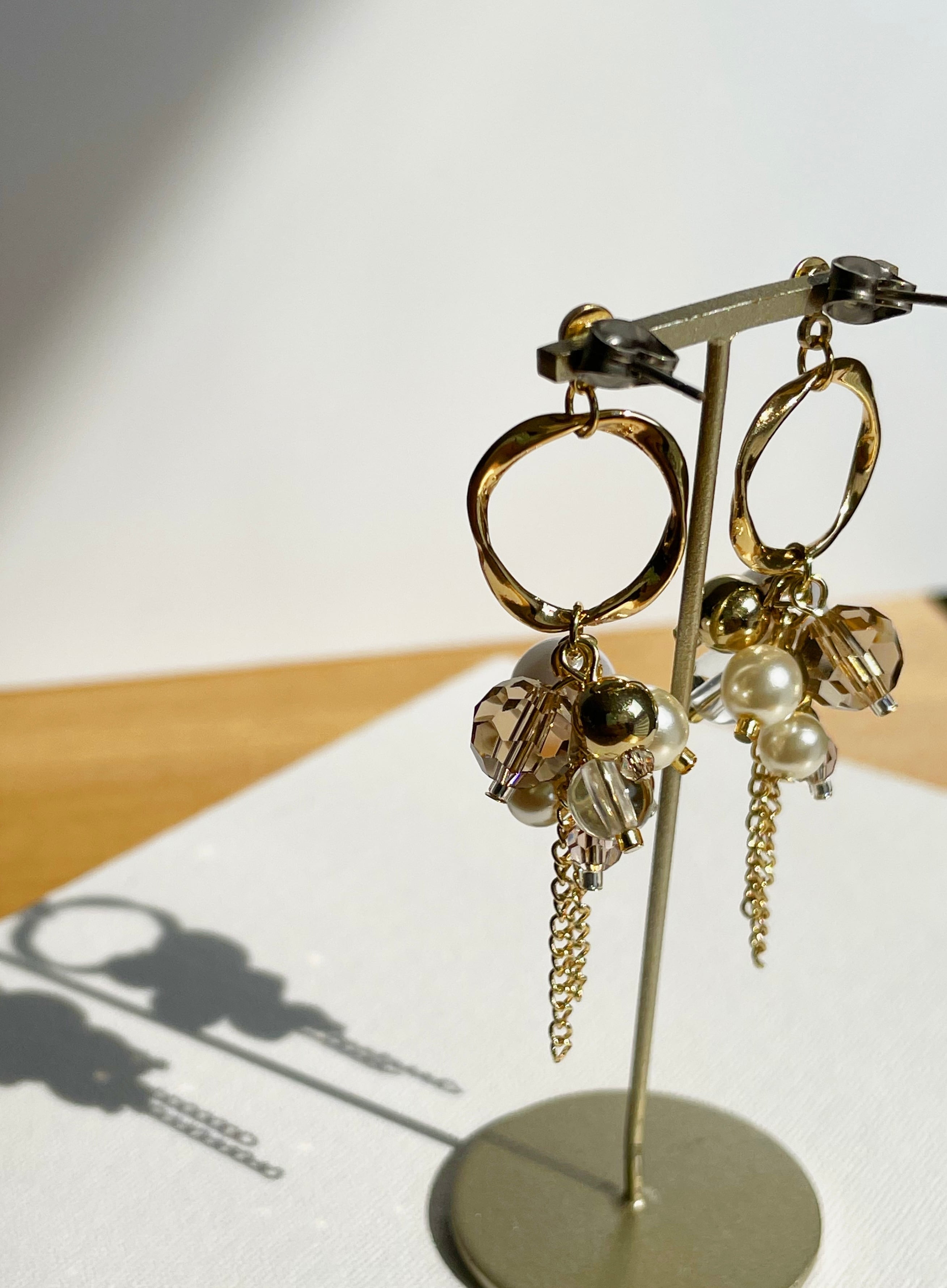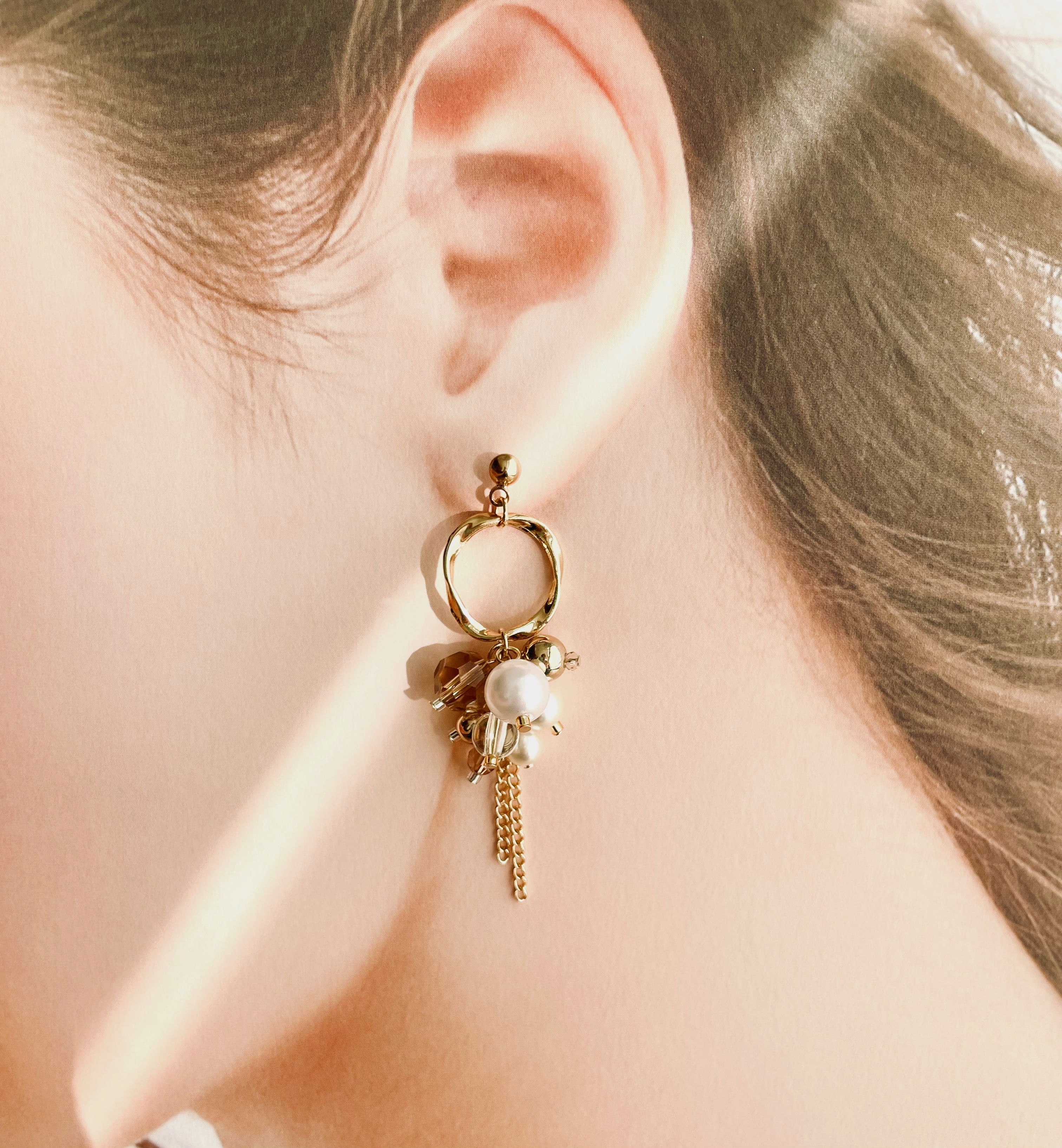 ゴールドフープの透け感が軽やかに魅せてくれるため、大きめビーズを使っている割にはどんなお洋服とも合わせやすいデザインです!